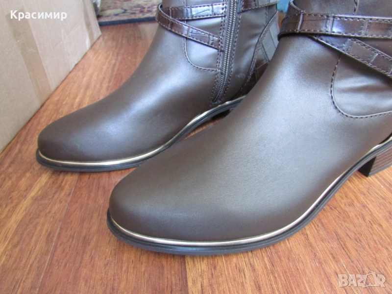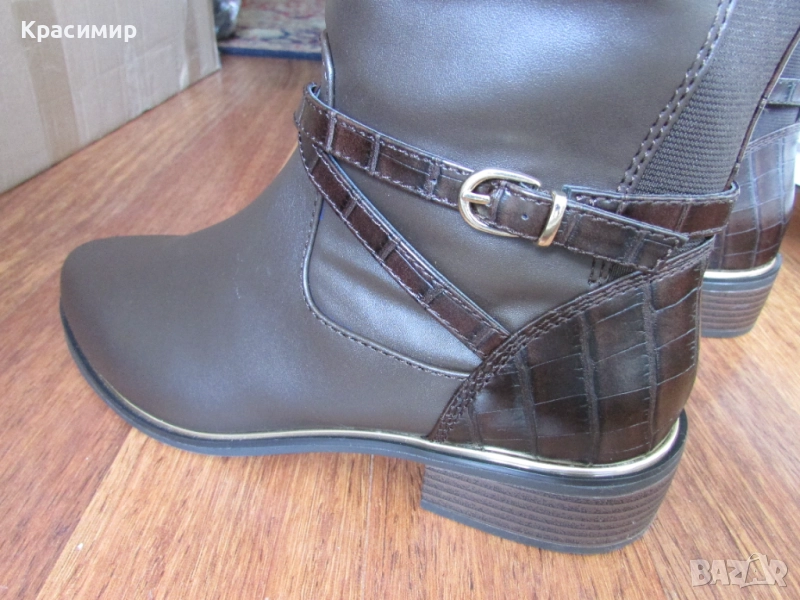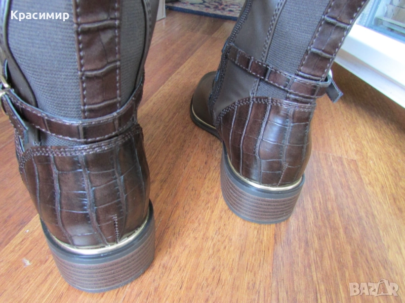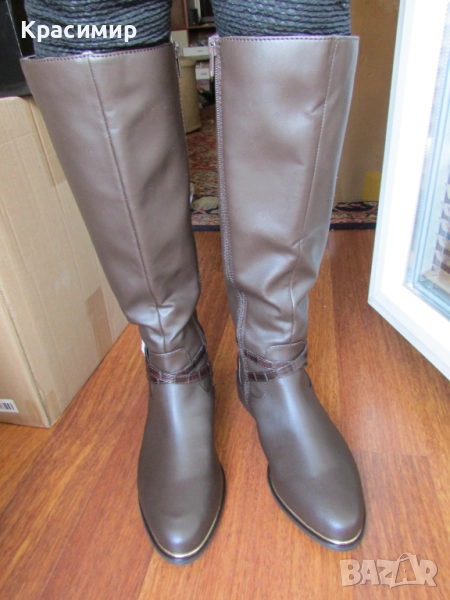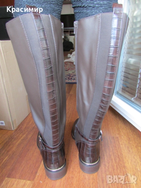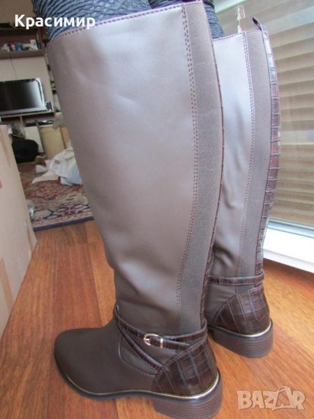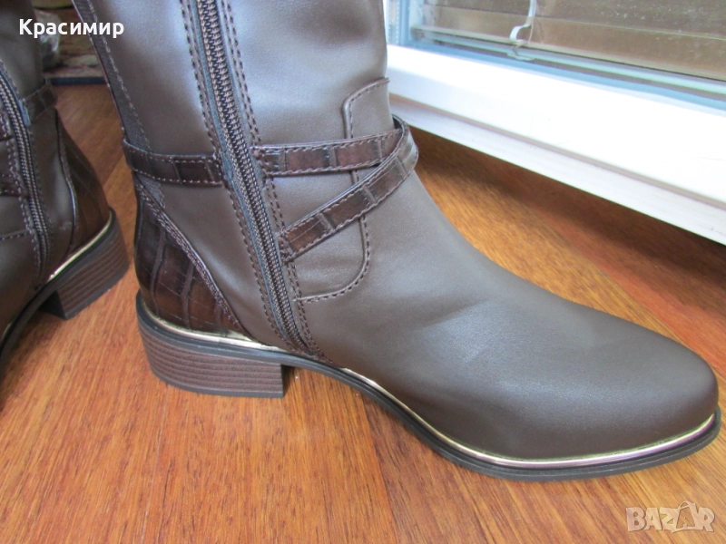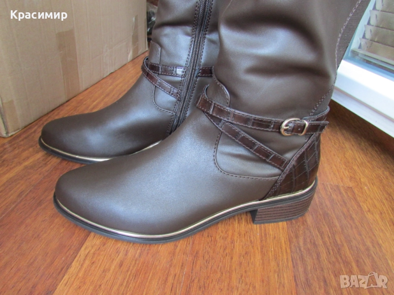 31: Дамски високи ботуши на реномираната английска марка - Dorothy Perkins, в кафяв цвят. Ботушите са с гладка кожа отпред, две текстилни еластични ленти отзад, разделени с лента тип крокодилска кожа, продължаваща на петата. С две пресичащи се каишки над глезена, като едната е с катарама, и жълта лайсна по цялата дължина на подметката за ефект. Закопчаването е с цип по цялата височина. Високи са 44 см, а тока - 3,5 см. Номер 40 с дължина на стелката 26 см.