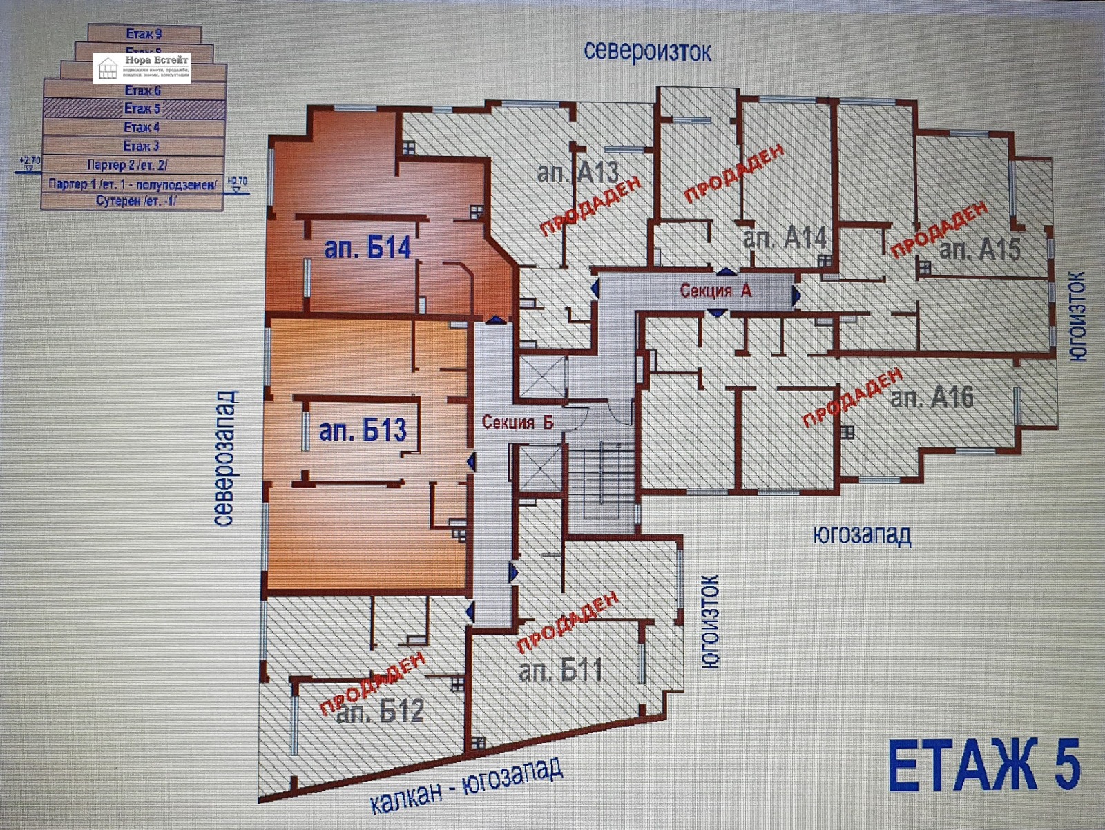 рулонна битумна хидроизолация. Покривът е с топлоизолация от каменна вата и покритие от битумна хидроизолация и битумни керемиди.Дограмата е с двойно отваряне от немски петкамерен РVС профил 76 мм, с троен стъклопакет 40 мм, като комбинацията на различните видове стъкла нискоемисийно стъкло, бяло флоатно и високоенергийно) ще е съобразена с изложението на отделните помещения.По пода на всички стаи и коридори в жилището се полага звукоизолация срещу ударен шум.Стените и таваните са на машинна шпакловка,а подът е с изравнителна армирана цименто-пясъчна замазка.Апартаментът е окабелен за интернет,телевизия и СОТ.За удобство на живущите са предвидени и 2 асансьора,които ще спират на всички нива.Общите части са луксозно изпълнение с ограничен достъп. Нора Естейт предлага за всички нуждаещи се от банково финансиране безплатна консултация с водещ в бранша кредитен консултант, който ще осигури най-добрите условия за Вас.За това предложение купувачът не дължи комисион!