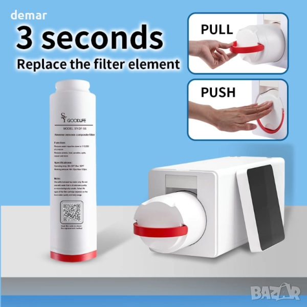 Този RO воден филтър е с мембрана от 0,0001 μm за ефективно отстраняване на частици и замърсители, осигурявайки чиста и здравословна питейна вода. Неговата безрезервоарна и безпомпена структура осигурява икономия на енергия с нулева консумация на енергия, а компактният дизайн го прави лесен за инсталиране и подходящ за различни кухненски пространства. Системата за смяна на филтъра push-pull позволява бърза и удобна смяна без професионална помощ. С 6-степенен процес на пречистване, той ефективно намалява хлора, оловото, тежките метали и други примеси, както и неприятните вкусове и миризми.