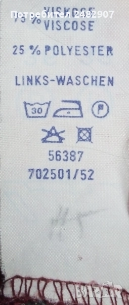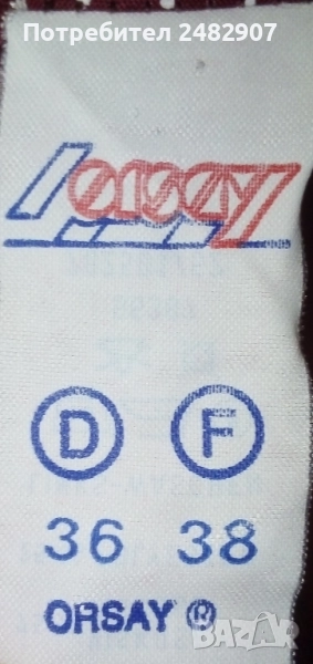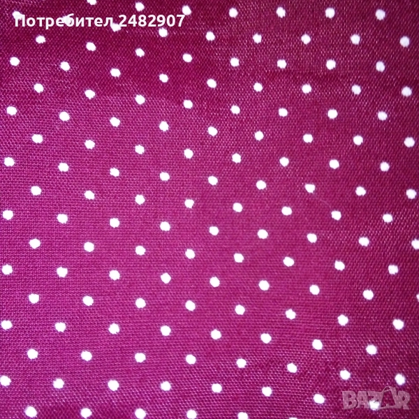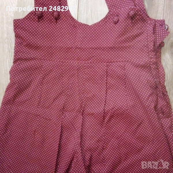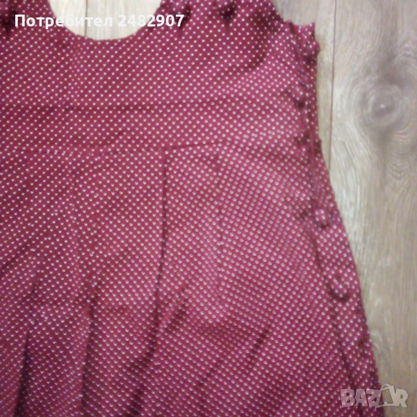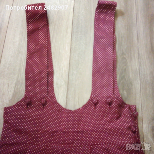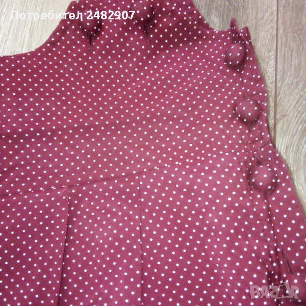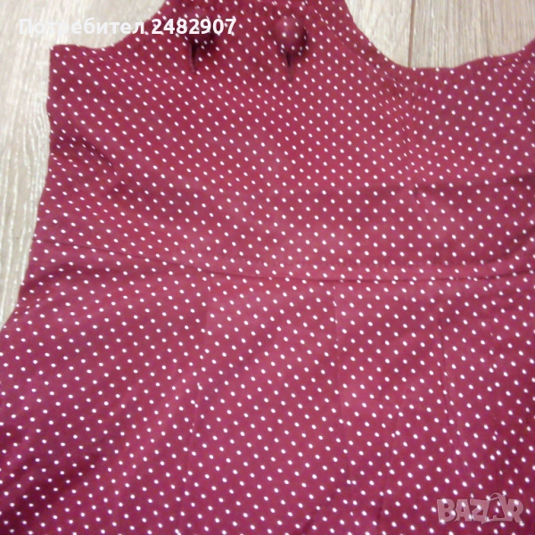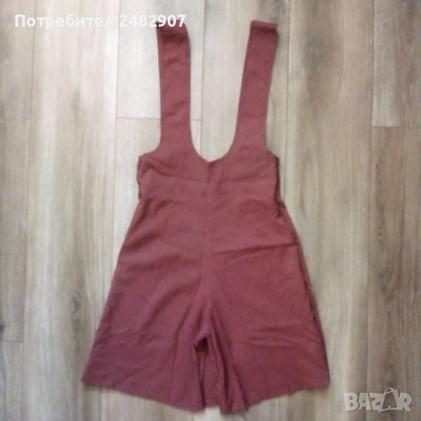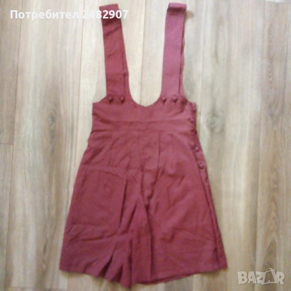 Ефектен дамски гащеризон, цвят бордо на бели точки, размер 36. Съдържа 75 % вискоза и 25 % полиестер. Ширина в талията - 34 см, дължина от талията до чатала - 30 см, дължина от талията до долу - 45 см, ширина на крачола в долната част - 33 см, дължина от горната част на презрамките до талията - 41 см. Много запазен, почти не е използван, закопчаване - с 5 броя обвити копчета в ляво.