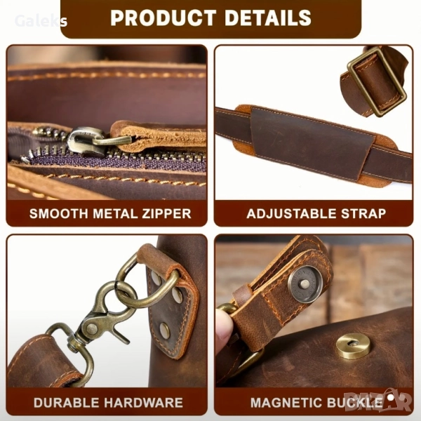 Подсигурена със здрави усилени шевове, регулируеми кожени презрамки и стилни ретро лицеви аксесоари с клипси.