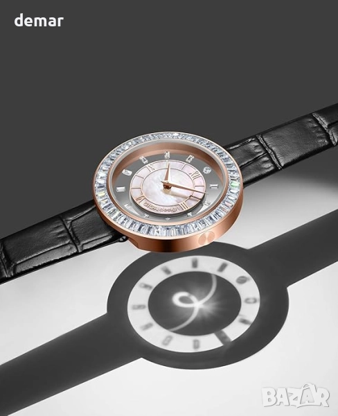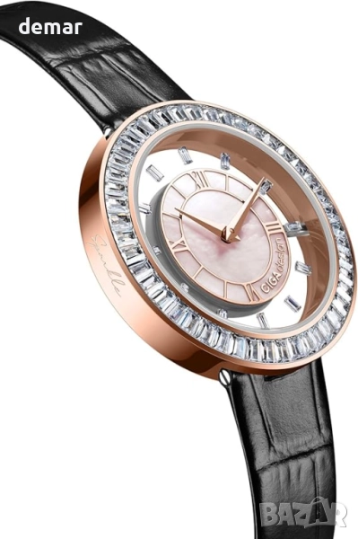 Този дамски часовник е с безел, украсен с 46 трапецовидно изрязани циркониеви камъка, които създават ефект на звездна светлина, съчетан със скелетообразен плаващ циферблат и дълбокоморски седеф за поразителен триизмерен чар. Интегрираният му дизайн образува безупречен 360° кръг със скрита коронка и уши, символизиращи вечността и хармонията. Докато светлината преминава през ажурния циферблат, тя създава грациозни дъги, които се изместват с движението, разкривайки фини дизайнерски детайли. Универсалният подвижен дизайн му позволява безпроблемно да се трансформира между часовник и гривна, което го прави подходящ както за елегантни поводи, така и за ежедневно носене.