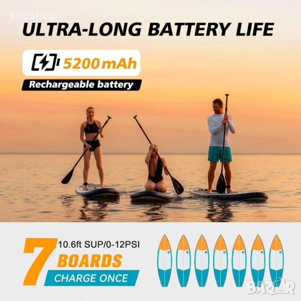 【Интелигентна електрическа помпа】Осигурява гаранция за издръжливост на батерията от 96,2 Wh, способна да надуе 𝗙𝗶𝘃𝗲 стандартни падълборд дъски с височина 10,6 фута до 15 PSI. По време на напомпването, помпата за падълборд има функция за автоматично изключване. Ще спре автоматично, след като се достигне зададеното ниво на PSI – което е определен бонус.