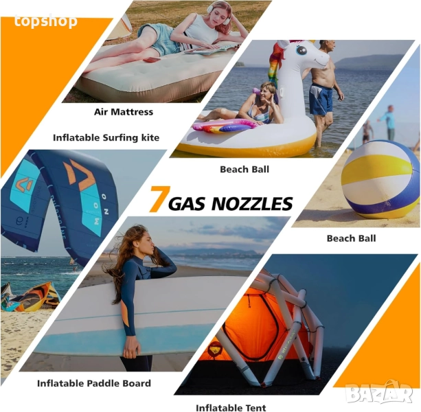 【Многобройни дюзи】Нашата електрическа SUP помпа се предлага с 𝟳 𝗗𝗔𝗞𝗔𝘇𝘇𝗹𝗲𝘀, съвместима с множество клапани, не само за SUP, но може да се използва и за надуване на надуваеми каяци, матраци, крила за кайт и палатки. Маркучът с дължина 3,28 фута (1,2 м) ви дава достатъчно място за маневриране с помпата около дъската.