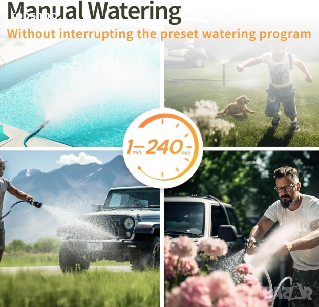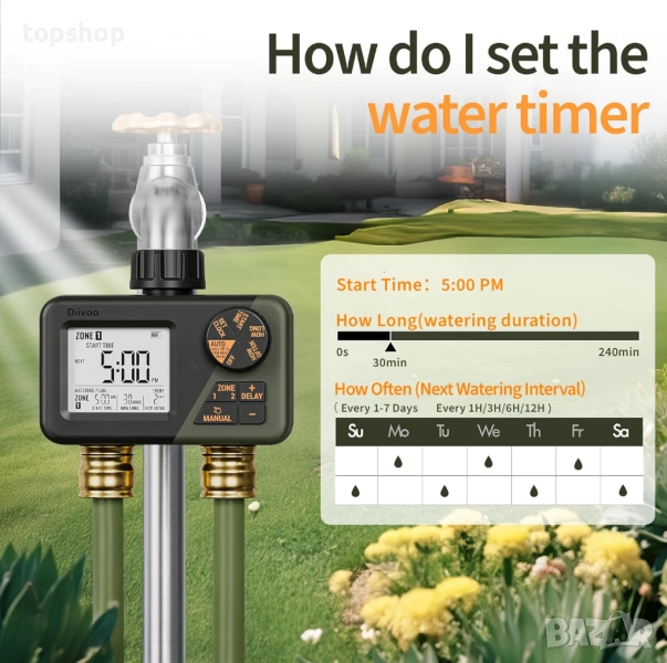 таймер за поливане: Таймерът за вода с 2 изхода улеснява планирането на поливането отделно за различните зони. Можете да зададете начален час, продължителността на поливането е от 0 до 240 минути, честотата на поливане от 1 час/3 часа/6 часа 12 часа или от всеки ден до всеки 7 дни, включително само четни или нечетни дни. Таймерът за маркуч Diivoo ви дава по-голяма точност за вашите променливи нужди от поливане.