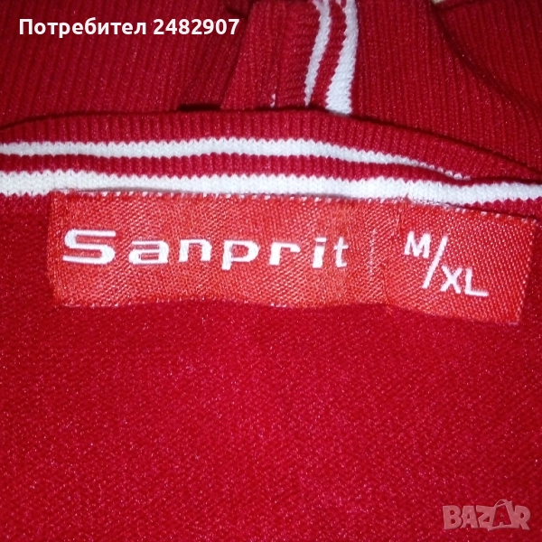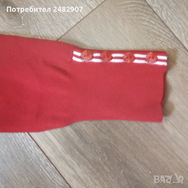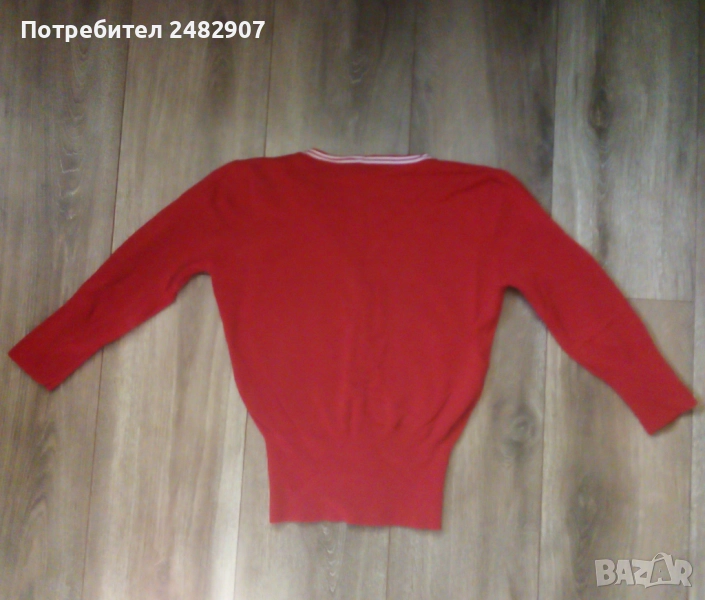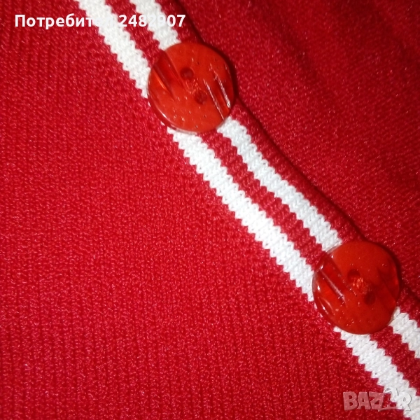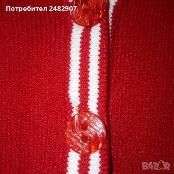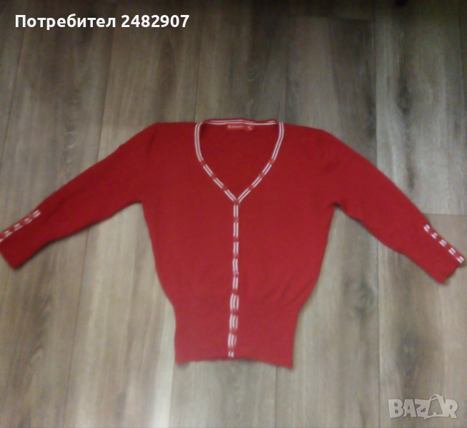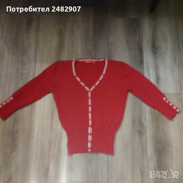 Машинно плетена къса дамска блуза в червено и бяло. Ширина в раменете - 35 см, ширина под мишниците - 42 см, ширина в долната част - 24 см, дължина от рамото до долу - 49 см, дължина на ръкава от рамото - 39 см, ширина на ръкава в долната част - 8 см. Много запазена, почти не е използвана, без забележки. Ефектна, леко еластична, може да се носи и като жилетка.