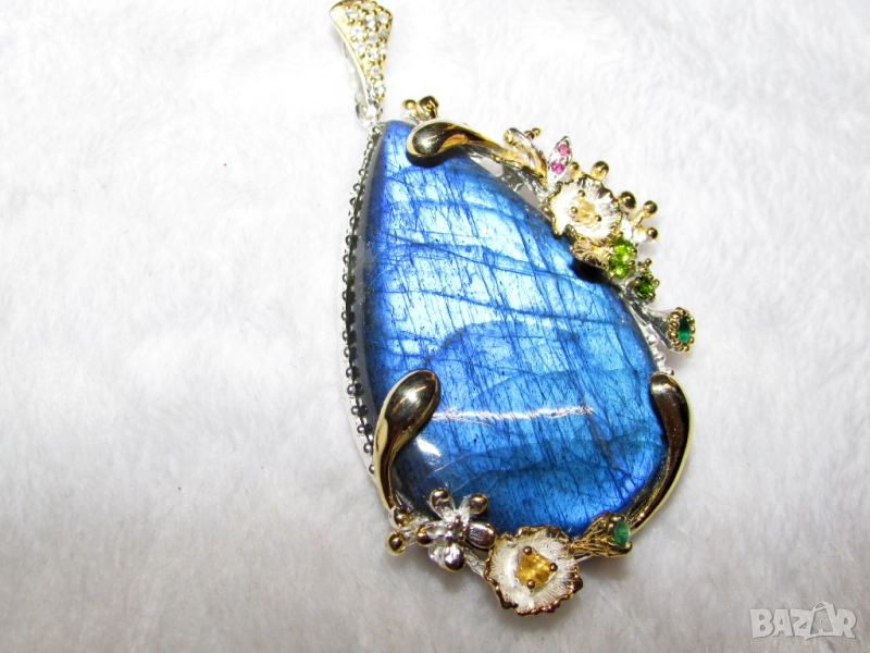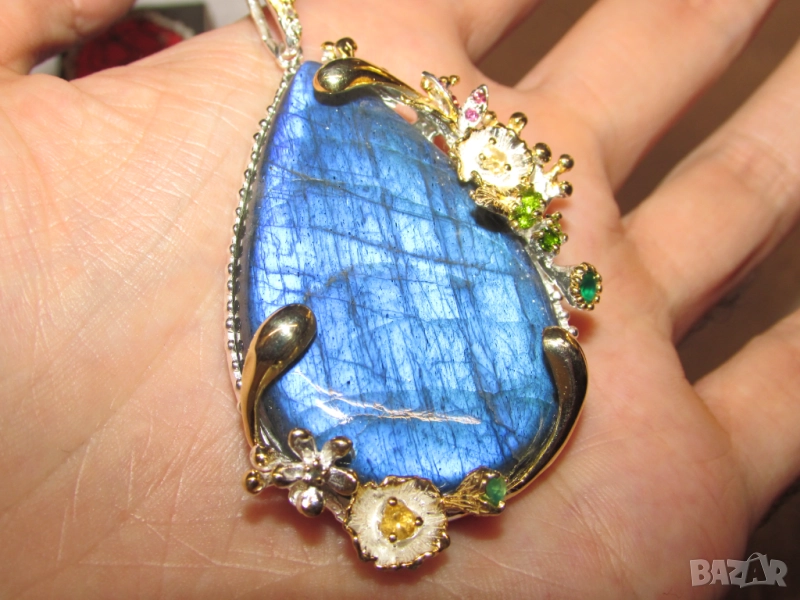 72x37x12, тегло на колието 32.9гр. Златно покритие. Другите камъни са оникс, цитрин и хром диопсид.Лабрадоритът е талисман на магове и шамани.