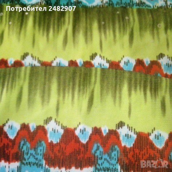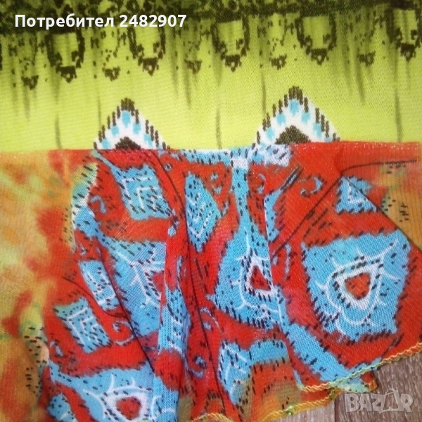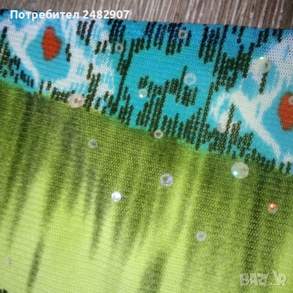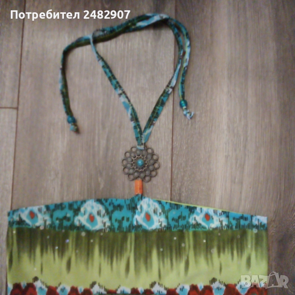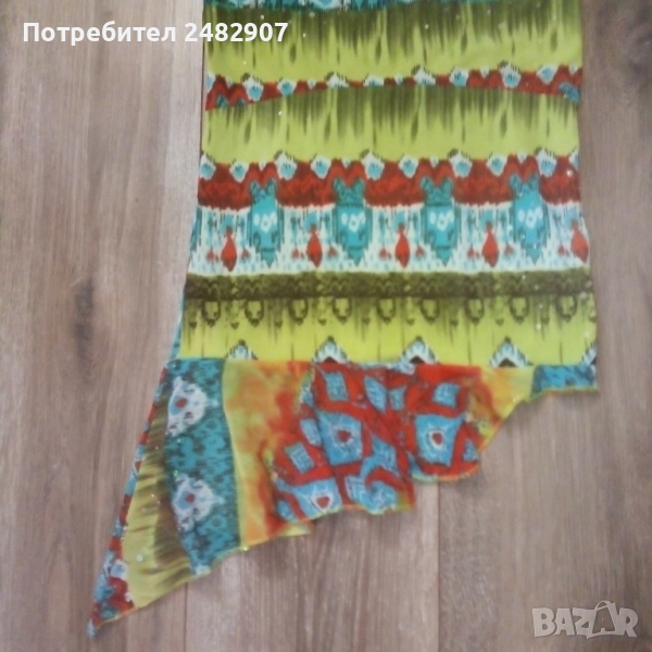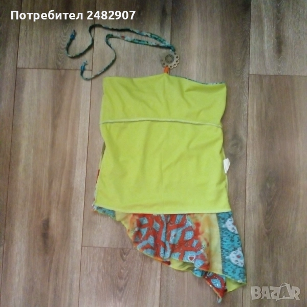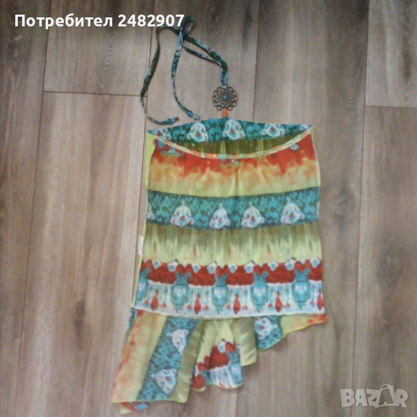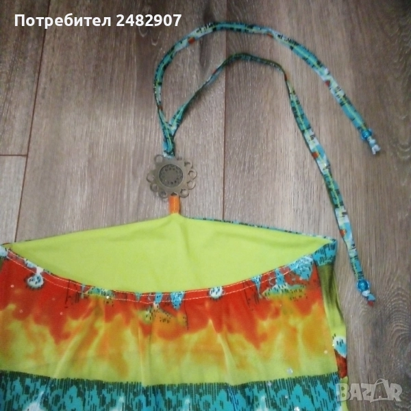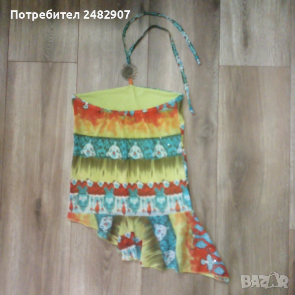 Ефектен детски асиметричен потник - тюл с гол гръб и връзки на врата за възраст 5-6 одини. Съдържа 100 % полиестер. Ширина под мишниците - 31 см, дължина от под мишниците до долу - 35 см (вляво) и 55 см (вдясно). Много запазен, почти не е използван, с подплата отпред и метален декоративен елемент на деколтето.