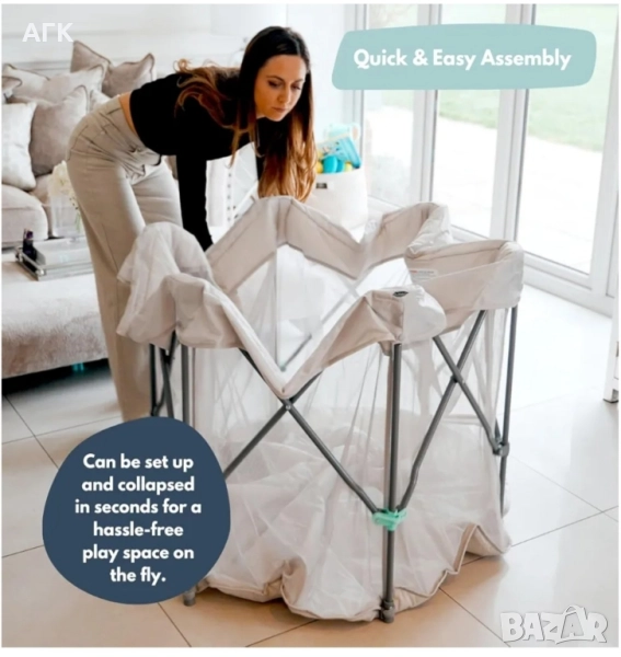 Бързо и безпроблемно сглобяване – Тази сгъваема кошара се сглобява за секунди, създавайки сигурна и просторна зона за игра. Независимо дали сте у дома, навън или на гости на семейството, тази кошара за бебета и малки деца прави родителството по-удобно.
