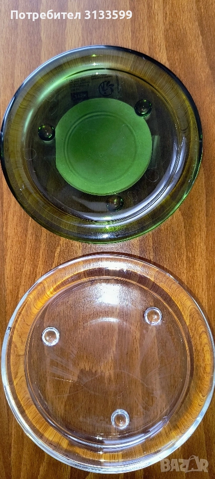- Два кръгли стъклени свещника: в зелено /нов/ и прозрачен /използван/ за чаени свещи. Диаметър: 10,7 см; височина: 1 см. ЦЕНА: 1,50 евро/брой