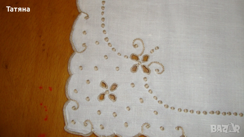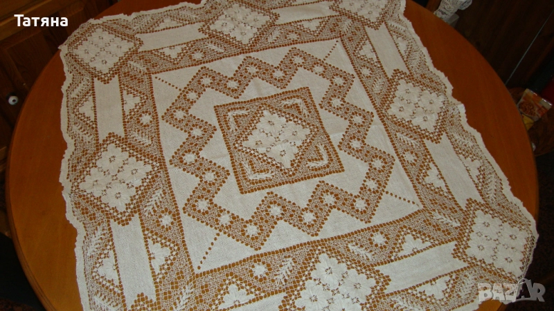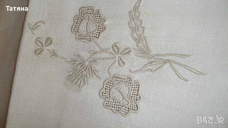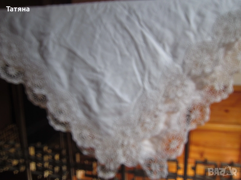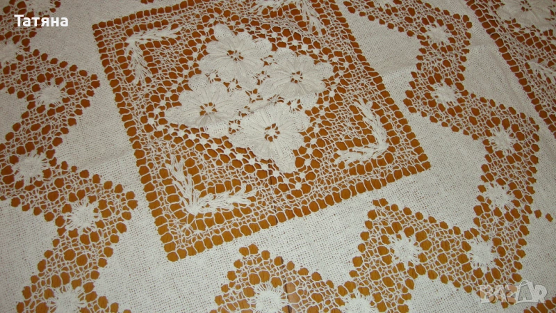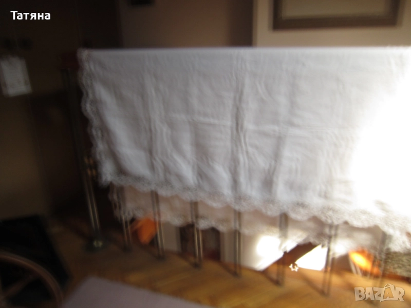 СНИМКИ 1- 4 Материята е лен и памук.РАЗМЕР 150/140см .ДАНТЕЛАТА е 8см; ръчно плетена /ПАМУЧНА / ;ЦЕНА -40 €.Снимка -2 е снимана в по-близък план,за да се виждат по-добре ДЕТАЙЛИТЕ.През седмицата ще кача нови снимки ,където ще се вижда по-ясно,защото покривката в действителност е много красива и НОВА,
