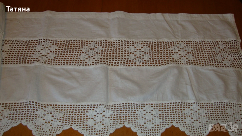 Снимки 10-11 ПАМУК -100% ;ПЕРДЕ /КЪСО/ 170/45см; ръчно изплетени мотиви - / 10см и 12см/.Монтира се на малък самостоятеле корниз / дървена .метална или пластмасова пръчка/,в зависимост от дограмата. Придава романтична атмосфера на стаята и позволява да влиза повече светлина в помещението.ЦЕНА -35 €