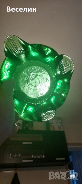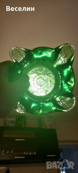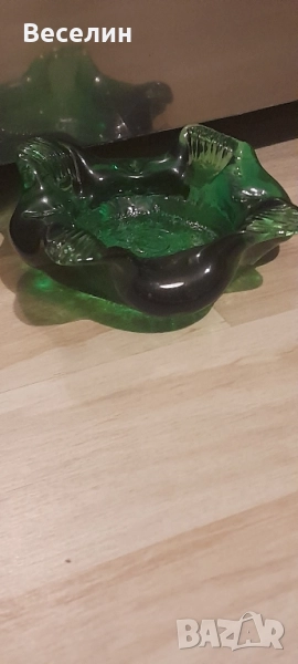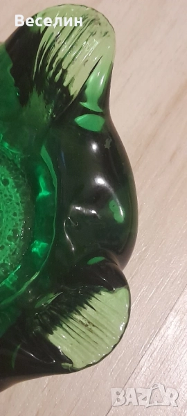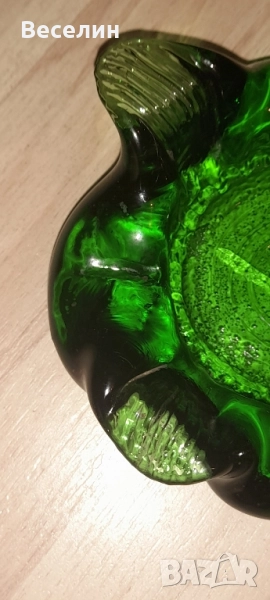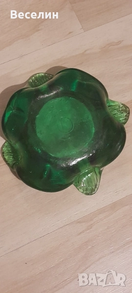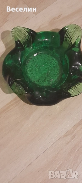 Великолепен пепелник цветно стъкло прекрасен зелен цвят интересен дизайн диаметър 15 см височина 4 см