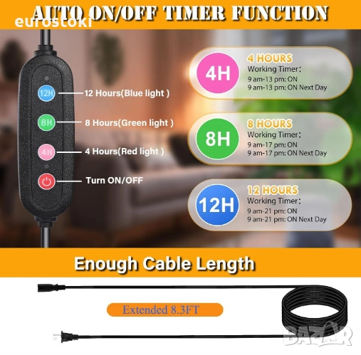 Вграден таймер. Автоматичният цикъл може да се настрои на 4, 8 или 12 часа. Лампата за растения се включва и изключва по едно и също време всеки ден, елиминирайки необходимостта от ръчно управление.