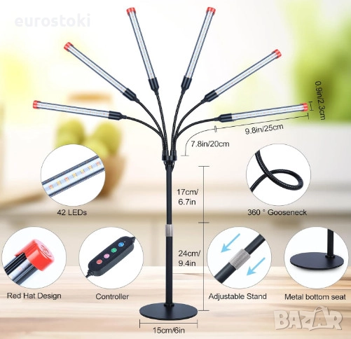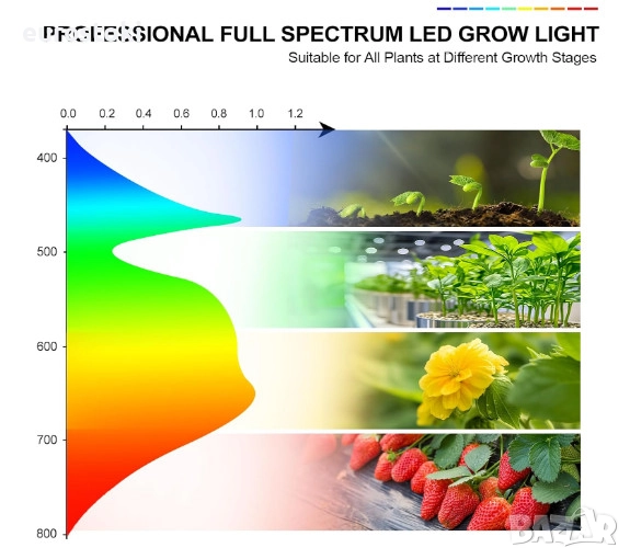 Фитолампа за растения с пълен спектър. Щадящите очите пълноспектърни светодиоди в цветови нюанси 3000K, 5000K и 660nm генерират светлина, подобна на естествената слънчева светлина, идеална за отглеждане на растения на закрито, като същевременно е комфортна за очите.