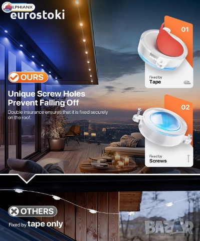 Лесен монтаж. Осигурено е професионално VHB лепило. Отлепете, залепете и натиснете всяка лампа за 8 секунди, за да осигурите здрава връзка. Подобрете стабилността, като използвате винтове, за да закрепите здраво лампите на място. Това означава, че не е нужно да губите време всеки сезон, сваляйки и монтирайки ги обратно.