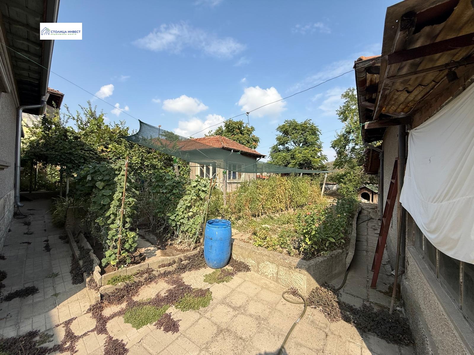 Дворът е с площ от 970 кв.м., равен и озеленен. В него са разположени стопански постройки, две летни постройки с прокарани вода и ток, два закрити гаража с канал, ток и вода в тях. Къщата също така е с канализация.