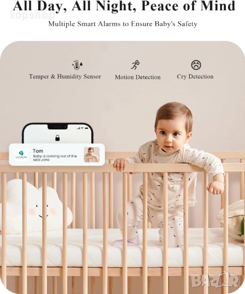 Нов WUUK 2K видео бебефон, 5.5'' с 360° PTZ цветен дисплей с широкоъгълно заснемане 135°, батерия 3700mAh, ултраясно нощно виждане, бебешка камера с приложение, сензор за температура и влажност, разпознаване на плач