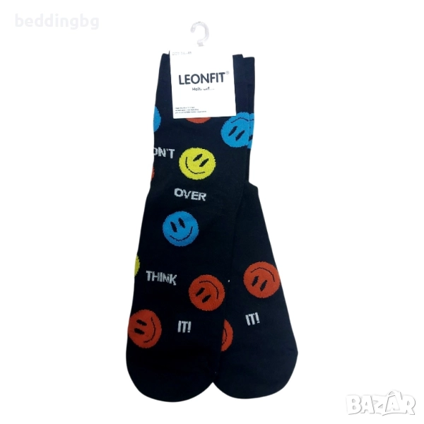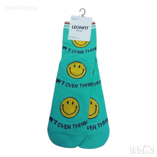 Чорапи с усмивки и надпис "don't overthink": два от чифтовете са с шарка на усмихнати лица и надпис "don't overthink". Единият е в тюркоазен цвят с жълти усмивки, а другият - в черен цвят с усмивки в различни цветове.