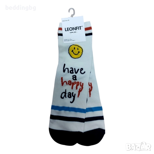 Чорапи с усмивка и надпис "have a happy day": този чифт е с райе и надпис.