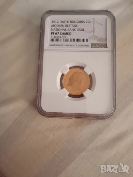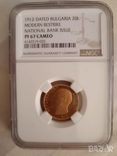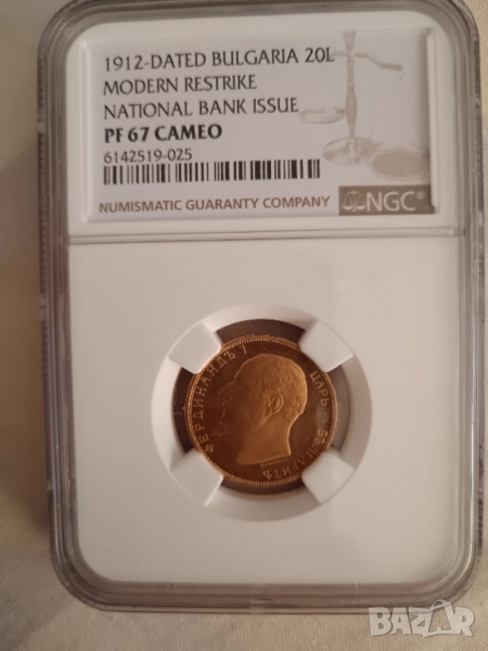20 златни лева 1912 година с грейд 67 рестрайк на БНБ от 1968 година тираж 1500 броя.6.45 грама AU900.