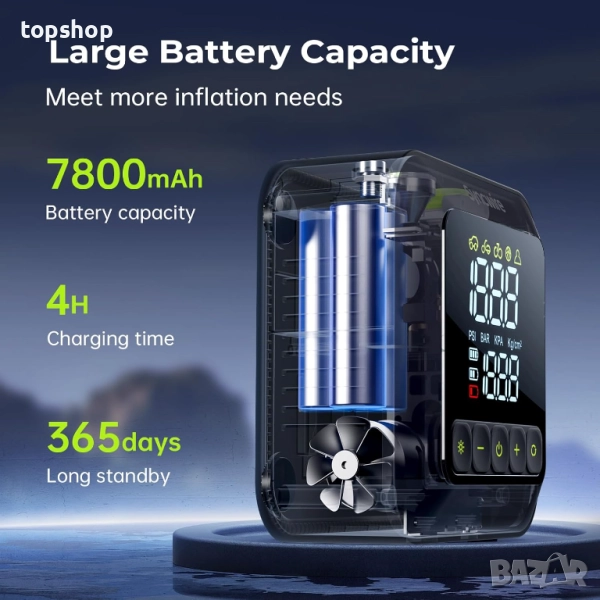 Супер бърз помпа с изключителна прецизност: Надува до 3 пъти по-бързо от конкурентите, с номинално налягане до 150 PSI и батерия 7800mAh, идеален за автомобилни гуми, велосипеди, мотоциклети и топки.