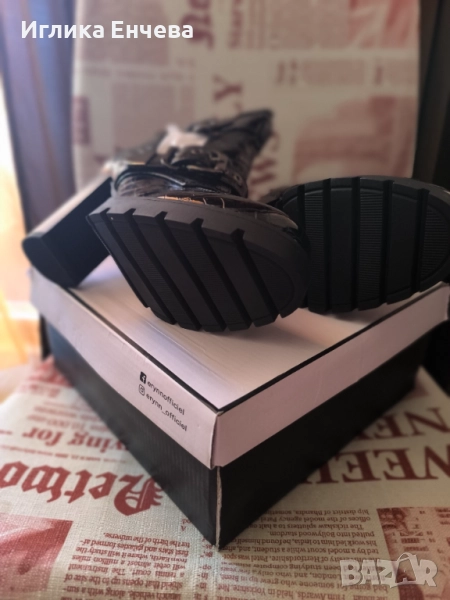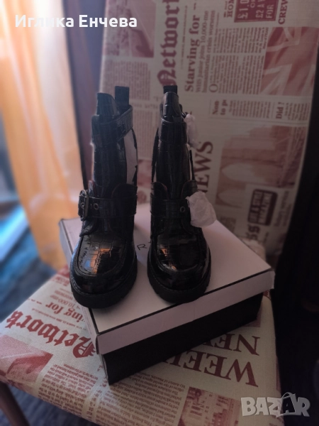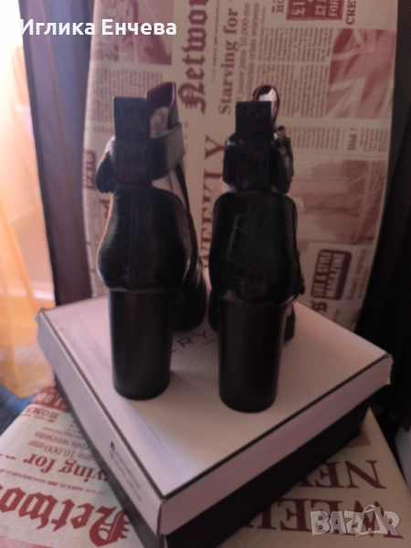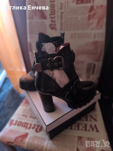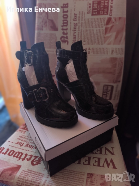 Уникални черни ( лак ) обувки на масивен висок ток и платформа. Имат предна украса във формата на верижка. Меката и удобна стелка е изработена от естествена кожа.