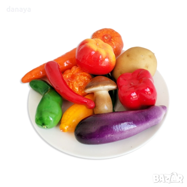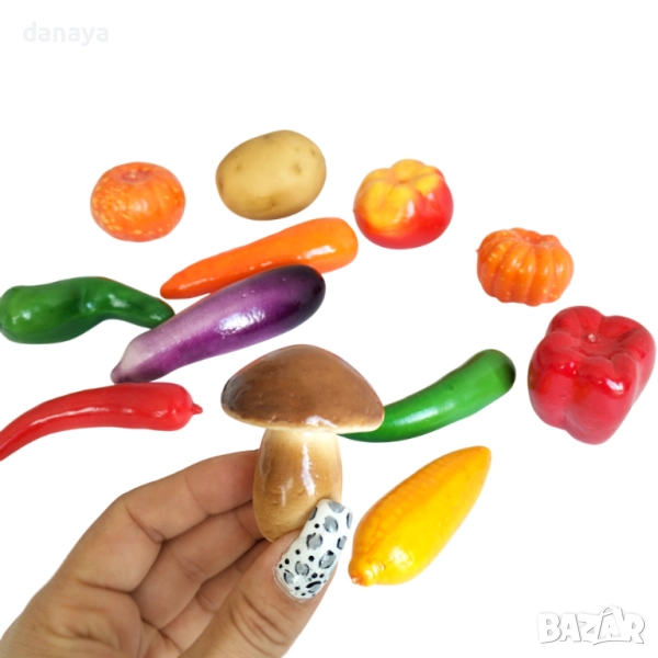 Включва: 2 зелени чушки (9×3 cm), патладжан (13×4 cm), червена чушка (10×2 cm), царевица (9×3 cm), гъбка (6×4.5 cm), морков (12×3 cm), картоф (8×6 cm), 2 мини тикви (5×4 cm), домат (6×4 cm), капия/камба (5×4.5 cm)