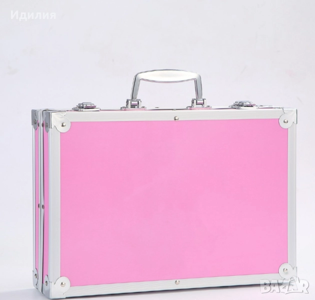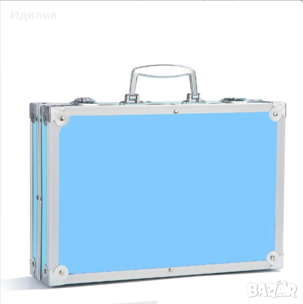 За допълнителна стабилност е подсилен с метални кантове и панти. Има и удобна дръжка за пренасяне както и щипки за затваряне.