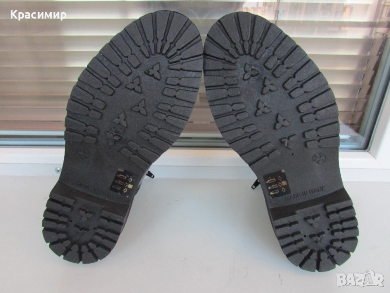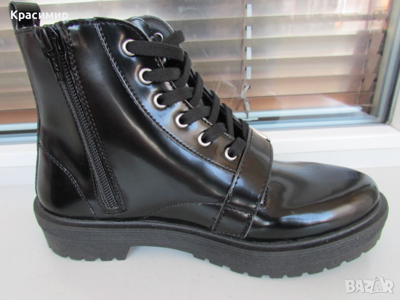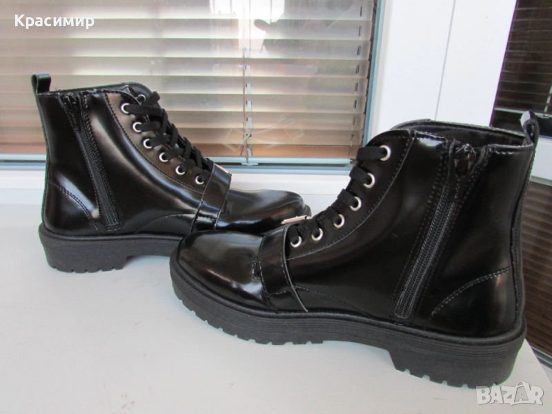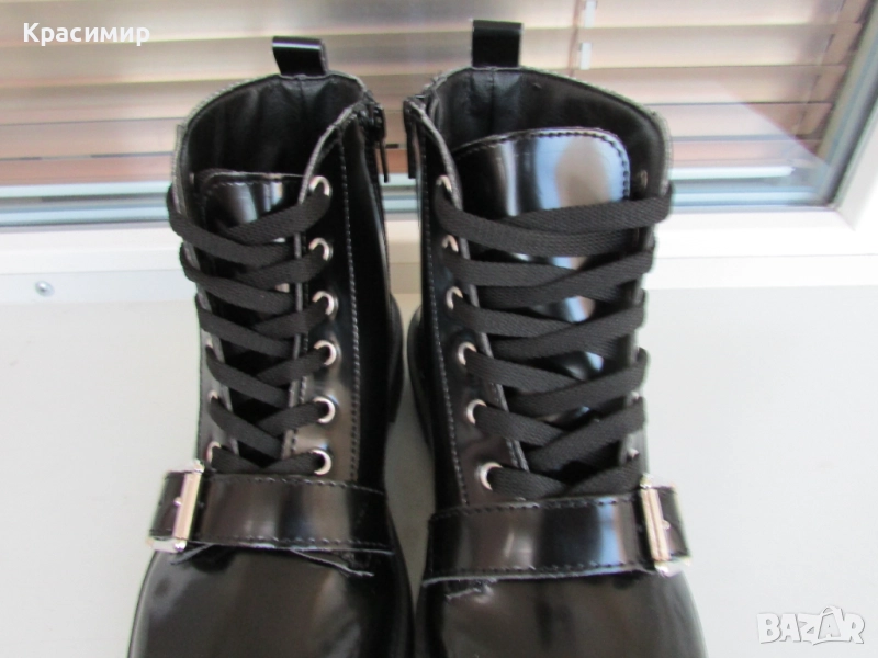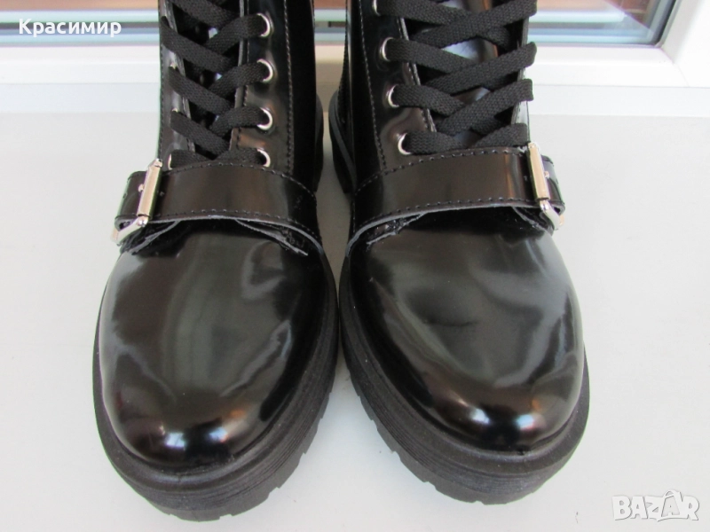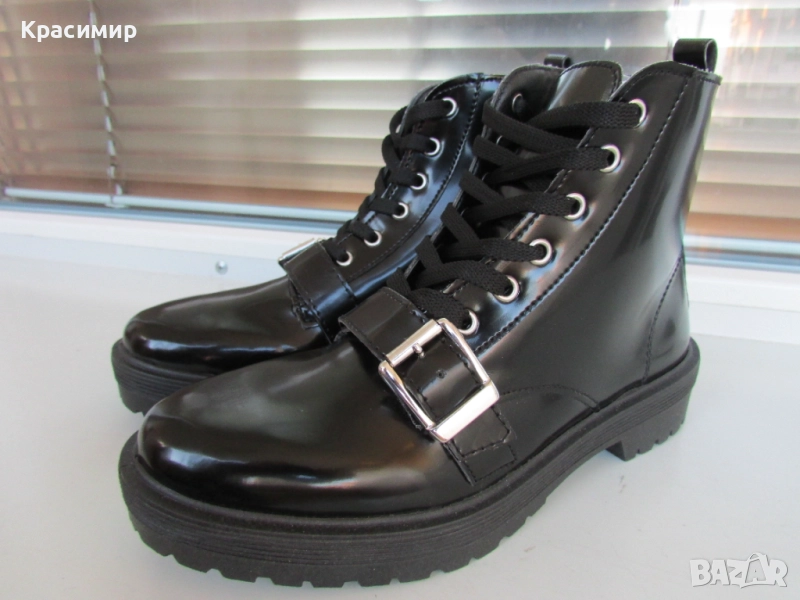 N:32 Дамски боти OASIS, в черен цвят и хромирана катарама с каишка отпред за декорация. Закопчаването е с връзки отпред и цип отстрани. Височината им е 15,5 см, а на тока 3 см. Номер 37 с дължина на стелката 23,5 см. Произведени в Италия.