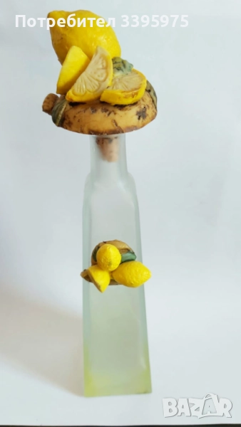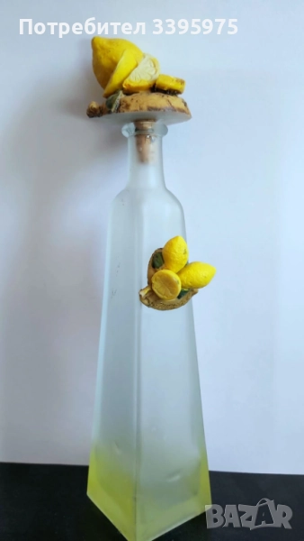 Оригинален комплект. Бутилката е изработена от матирано стъкло с декоративна запушалка и елементи с форма на лимон. Надписът върху бутилката: ”Limoncello”.