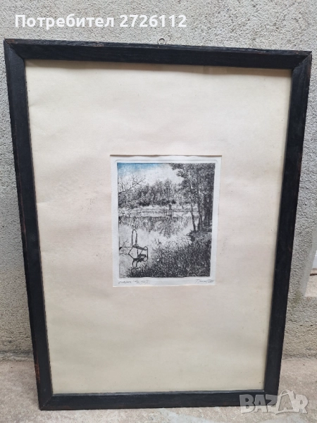 Стари картини - рамкирана графика, изобразяваща пейзаж с езеро и дървета. Картината е в добро състояние, с рамка в черен цвят. Подходяща за декорация на дома или офиса. Също така предлагам и 1 рамка