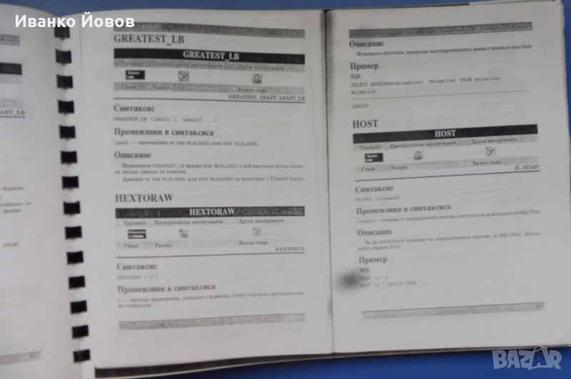 команди, показващ синтаксис и примери на стотици команди на SQL, PL/SQL и SQL