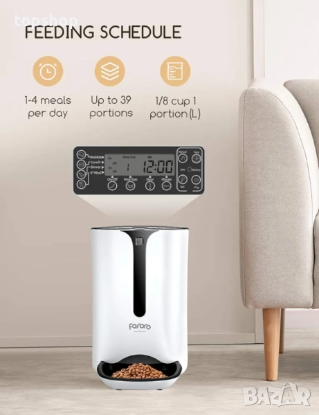 ГЪВКАВО ВРЕМЕ И РАЗМЕР НА ХРАНЕНЕ - Програмирането е много лесно, можете гъвкаво да задавате конкретно време и размер на храненето. Можете да програмирате таймера да разпределя до 4 хранения на ден. Задайте конкретно време за всяко хранене и колко храна да разпределите. Размерът на порцията варира от 2 чаени лъжички до 4,5 чаши суха храна. Можете да храните според вашия план, за да сте сигурни, че домашният любимец няма да е гладен.