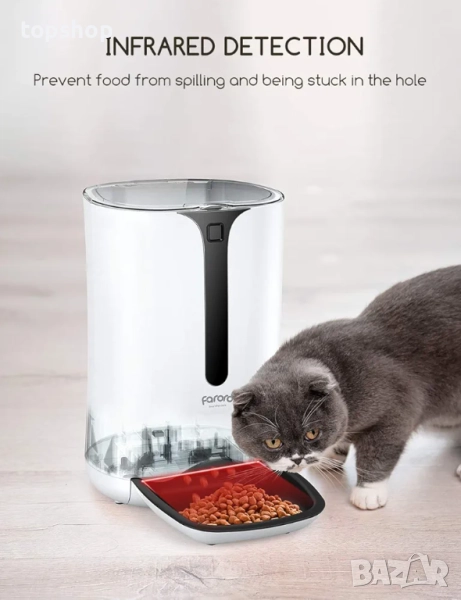 Автоматична хранилка за котки и кучета Faroro PF31 за малки домашни любимци с аларми за разпределение, контрол на порциите, гласов рекордер и програмируем таймер до 4 хранения на ден