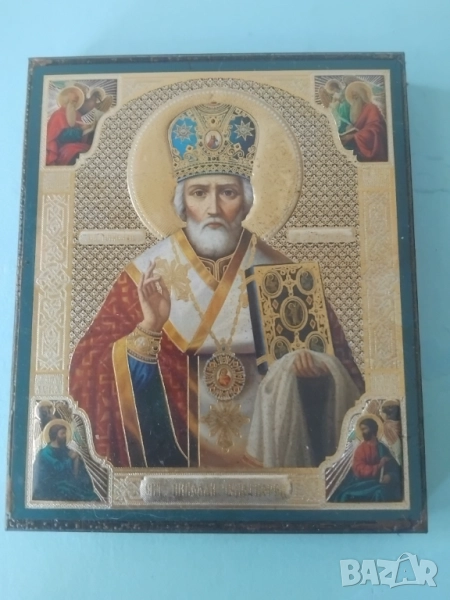 Икона на Свети Николай Чудотворец, изобразяваща светеца в пълно облекло на епископ, с митра на главата и държащ в ръцете си Евангелие и епископски жезъл. Иконата е изработена в традиционен стил и е в добро състояние, подходяща за украса на дом или църква.