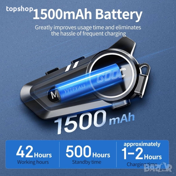 【Капацитет на батерията 1500mAh за високоговорител за каска】Bluetooth слушалките за мотоциклет съдържат акумулаторна полимерна батерия с капацитет 1500mAh, която може да се използва непрекъснато в продължение на 180 часа след 2 часа зареждане. Значително удължено време за употреба, няма нужда да се притеснявате за зареждането по време на дълги пътувания на открито.