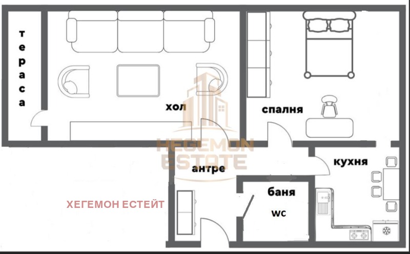 Коридор; Всекидневна с трапезария с усвоена тераса; Хол с излаз на тераса; Спалня; Тераса; Баня с тоалетна.