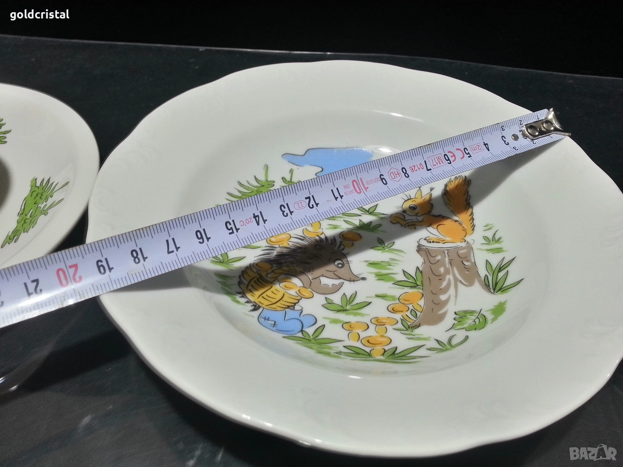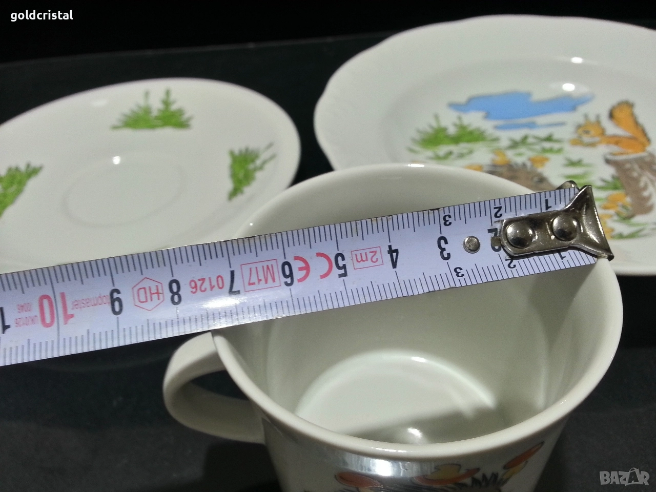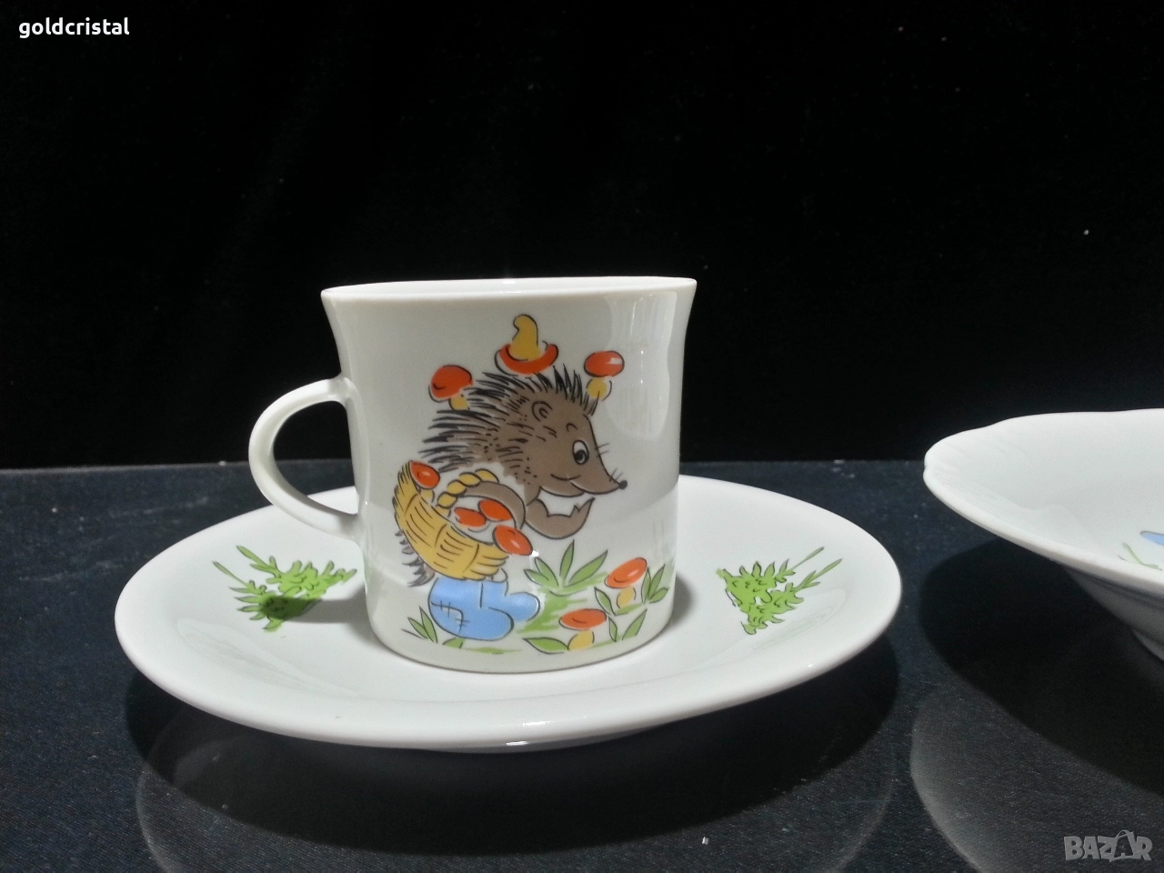 български порцелан детски комплект за хранене чаена чаша с чинийка и дълбока чиния неизползвани сервиз комплект сет лот ретро арт декор винтидж колекция стари старинни антикварни предмети обзавеждане за дома и семейството подходящи за подарък за ценители и колекционери
