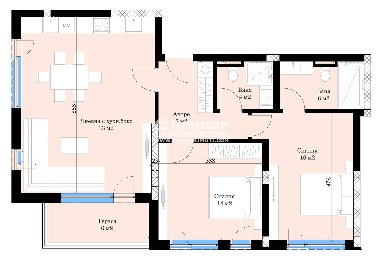 Оферта 67783: Предлагаме ви възможността да си закупите жилище в малък бутиков затворен жилищен комплекс, състоящ се от само две сгради с модерна и устойчива архитектура, разположен в една от най - предпочитаните и озеленени зони на града в непосредствена близост до Гребна База и Парк отдих и Култура. Комплекса предлага просторна спокойна среда с бърз достъп до центъра на града, както и възлови булеварди, предвидено е облагородено дворно място между сградите, зони за отдих, детски площадки за игра и стрийт фитнес. Апартамента е на 3-ти етаж и се състои от просторна и ъглова дневна с трапезария- 33кв.м. и кухненски бокс и излаз на тераса, две големи и комфортни спални: родителска стая с площ от 16кв.м. и разполага със собствена баня с тоалетна, детска 14кв.м., втора баня с тоалетна, която обслужва другите стаи и широко входно антре с място за вграден гардероб и опция за перално помещение. При проектирането е заложено на материали от висок клас и е обърнато внимание на всеки детайл, като апартаментите ще бъдат издадени на: Стени и тавани гипсова мазилка, Под - циментова замазка; Под в санитарни помещение циментова замазка; Стени в санитарни помещения вароциментова мазилка, Тераси /под/ - мразоустойчив гранитогрес. Входни врати на апартаменти блиндирани, бързи хидравлични асансьори, ПВЦ дограма с троен стъклопакет. Архитектурата е съвременна, визията на комплекса модерна и в унисон с тенденциите за жилищно строителство. Паркирането е осигурено на 100% посредством надземни паркоместа и гаражи. Възможност за разсрочено плащане или закупуване чрез Банков кредит!!!ВИЖТЕ ОЩЕ ИЗГОДНИ ОФЕРТИ НА https://www.kondorimoti.com/ С ЕЖЕДНЕВНА АКТУАЛИЗАЦИЯ!