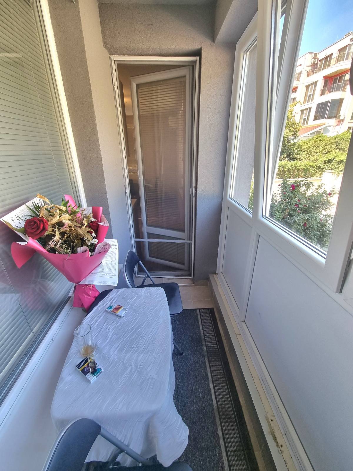 Имотът представлява: Голям коридор, просторна и слънчева всекидневна, от която се излиза на остъклена тераса, функционална спалня, баня с тоалет и маза. Имота се продава с цялото обзавеждане. Има възможност за закупуване на външно паркомясто.