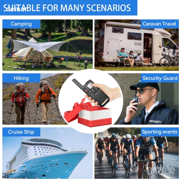 Тази уоки-токи предлага обхват до 8 километра с 20 налични канала, което я прави практична за дейности на открито и употреба в училище. Тя е водоустойчива със степен на защита IP54 за надеждна работа при различни условия и включва полезни екстри като вградено фенерче, хронометър, компас и метеорологични сигнали на NOAA. SOS функцията добавя допълнителна безопасност, което я прави подходяща за къмпинг, туризъм или ежедневни комуникационни нужди.