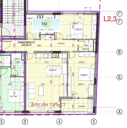 Brain Тrust предлага тристаен апартамент в сграда на площад Родина. Състои се от хол с трапезарна част и кухненски бокс, една master bedroom със отделна баня с тоалетна и една отделна спалня. Към холната част и обикновената спалня има лоджия с два входа, съответно от двете пространства. Към жилищетоима още една баня и складово помещение от 2,59 кв.м.