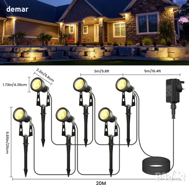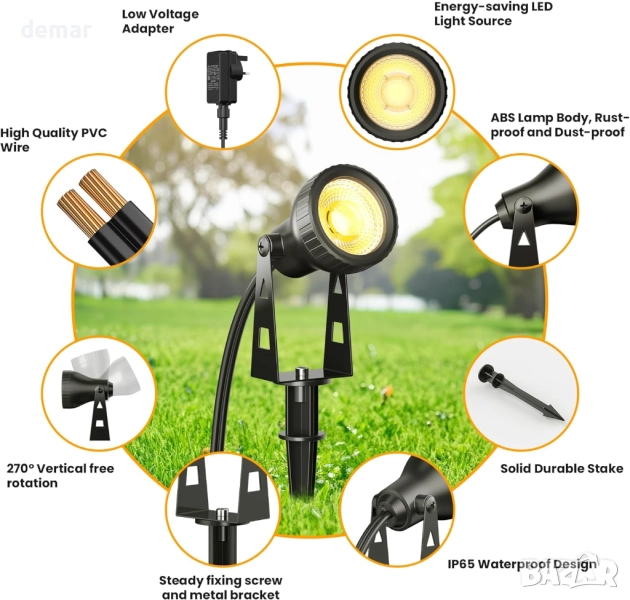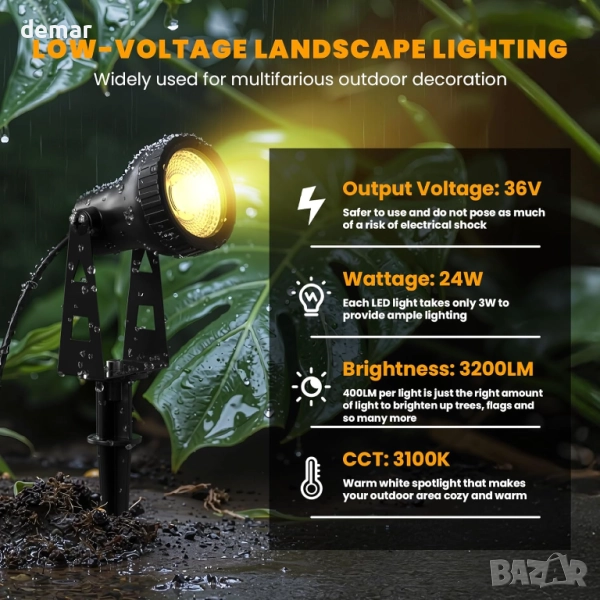 Тези нисковолтови ландшафтни лампи осигуряват по-безопасна употреба на открито с трансформатор, намаляващ 230V на 36V, което ги прави подходящи около деца и домашни любимци. Енергийно ефективните LED прожектори консумират само 18W, като същевременно произвеждат ярки лъчи от 400 лумена, идеални за осветяване на градински елементи, пътеки и вътрешни дворове. Проектирани с водоустойчивост IP65 и устойчив на ръжда корпус, те издържат на всякакви метеорологични условия за надеждна дългосрочна употреба. Системата „plug-and-play“ включва шест лампи на 20-метров кабел, предлагайки лесен монтаж с колове за закрепване към земята или опции за стенен монтаж. С регулируеми на 270° глави и топла светлина 3100K, те са идеални за подобряване на широк спектър от външни пространства.