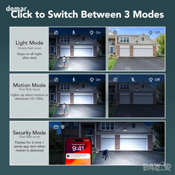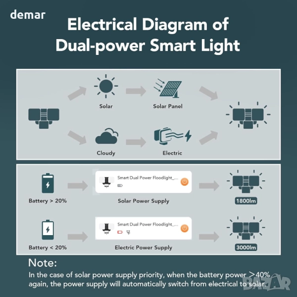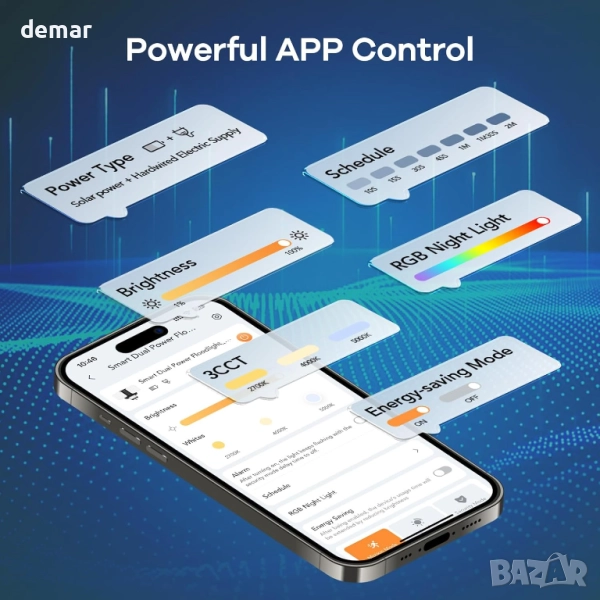 Тази външна лампа комбинира двойно захранване - слънчево и кабелно - за непрекъсната употреба, с интелигентно управление чрез приложение за регулиране на яркостта, цветната температура, RGB ефектите, продължителността и режимите на захранване. Тя предлага широк ъгъл на откриване от 240° с обхват от 15 м и регулируема чувствителност, което я прави надеждна за по-големи площи. Множеството режими на осветление включват сензор за светлина, сензор за движение и сигурност, с избираеми топли, естествени или студени тонове за различни настройки. Изградена с водоустойчивост IP65 и силна устойчивост на топлина и студ, тя е проектирана да издържа на всякакви метеорологични условия, като същевременно осигурява надеждно външно осветление и сигурност.