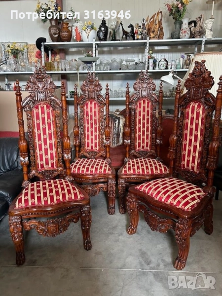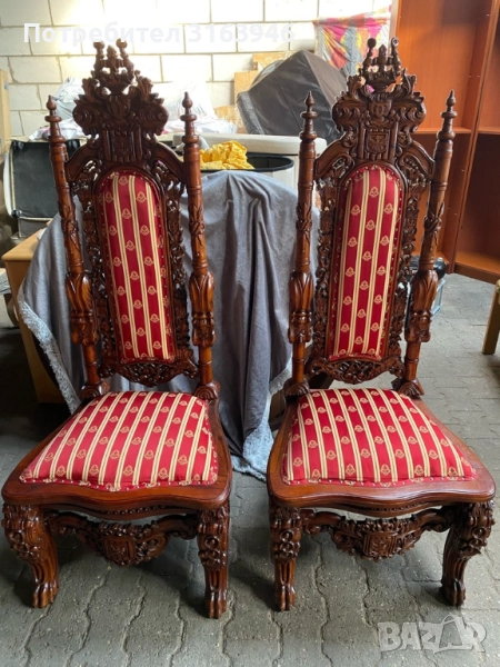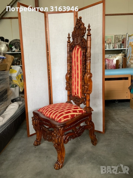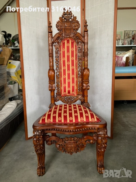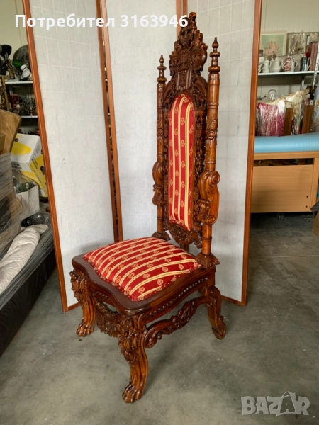 луксозен антикварен трон в готически стил, изработен от масивно дърво с изключително прецизна дърворезба. Столът е тапициран с богата дамаска в червено и злато, придаваща царствена елегантност. Отличава се с висока облегалка, детайлно изработени орнаменти и герб, което го прави перфектен избор за декорация, фотосесии или интериори с кралски привкус.