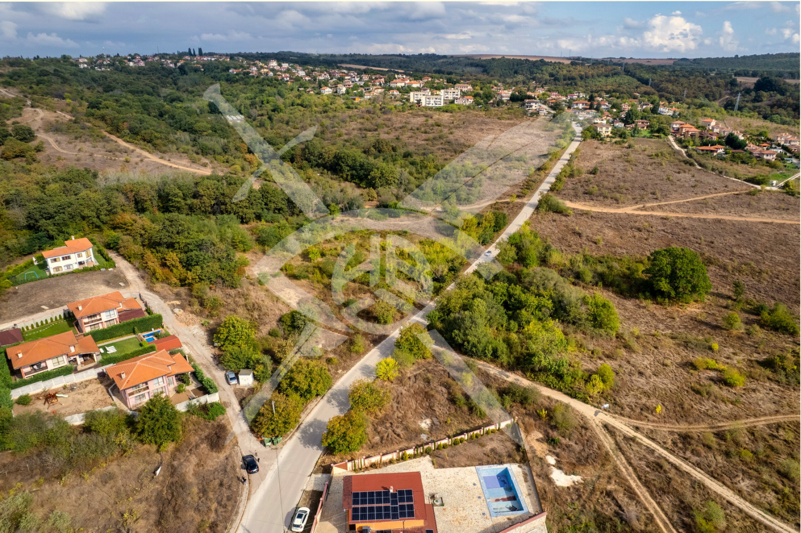РАЗПРЕДЕЛЕНИЕ: Парцелът е с площ от 1000 кв.м., урбанизирана територия - в регулация. Има вода и ток в близост до имота. Разположен е на южен склон с красива панорама към околните хълмове и морето.