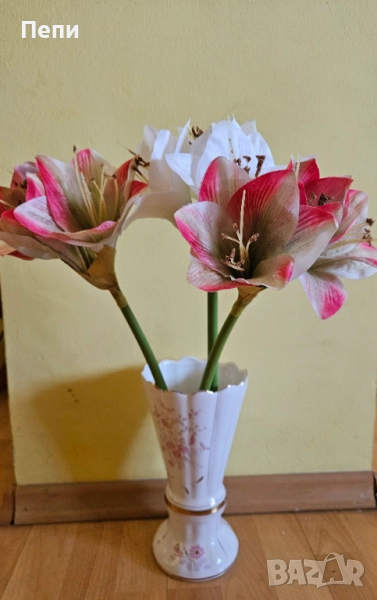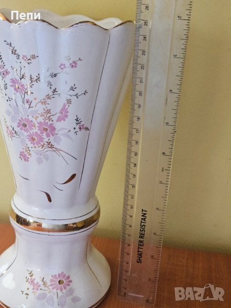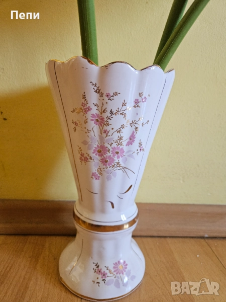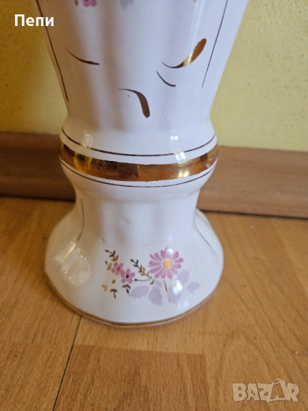 Прекрасна ваза с антикварна и естетическа стойност. Висока е 25 см. Златната украса е като нова. По бялата глазура на вътрешната страна има пропукване, повърхностно, много фино като паяжина.