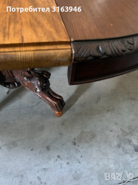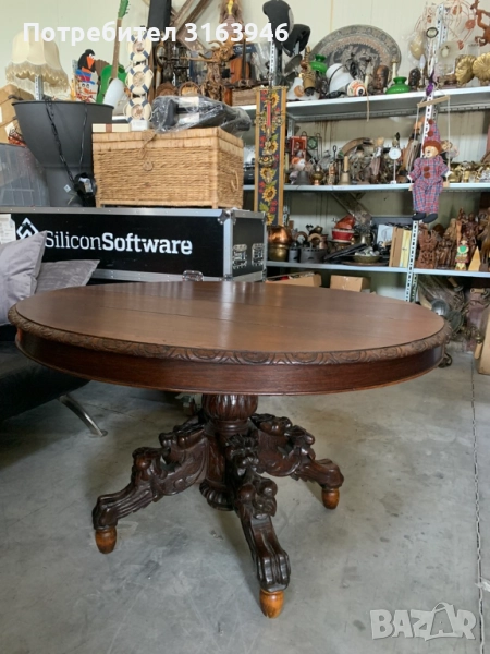 Внесете изтънченост и класа във вашия дом с тази изключителна антична кръгла маса. Изработена от масивно дърво, масата впечатлява с детайлна ръчна резба по ръба на плота и по изящно оформената централна стойка с четири крака, завършващи с крачета в стил “лапи”.