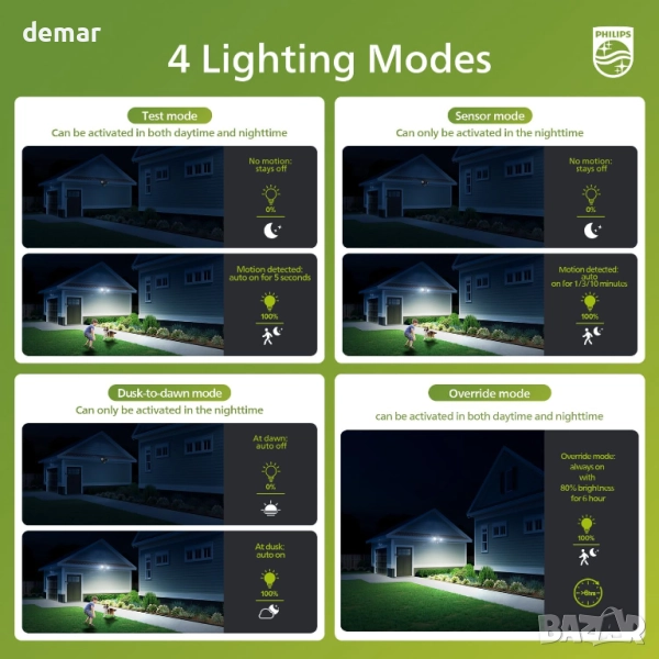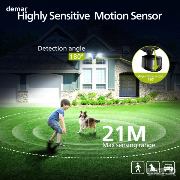Този външен охранителен прожектор осигурява 3000 лумена ярка дневна светлина с цвят 5000K и две регулируеми глави за широко покритие. Неговият PIR сензор предлага обхват на откриване от 0 до 21 м с ъгъл на заснемане от 180° и поддържа четири режима: тест, охрана, от здрач до зори и ръчно управление. Изработен от издръжлив алуминий и с водоустойчивост IP54, той издържа на дъжд, влага, слънце и екстремни температури. Вграденият 21W LED спестява до 80% енергия в сравнение с традиционните крушки, без да е необходима подмяна. Лесен за инсталиране с включените аксесоари, той е подходящ за множество външни зони като градини, гаражи, веранди и пътеки, подобрявайки сигурността и видимостта.